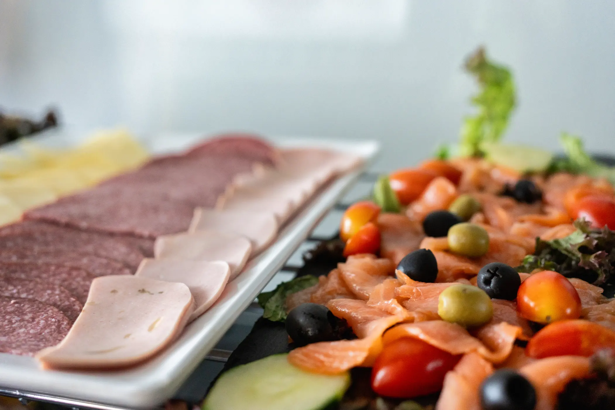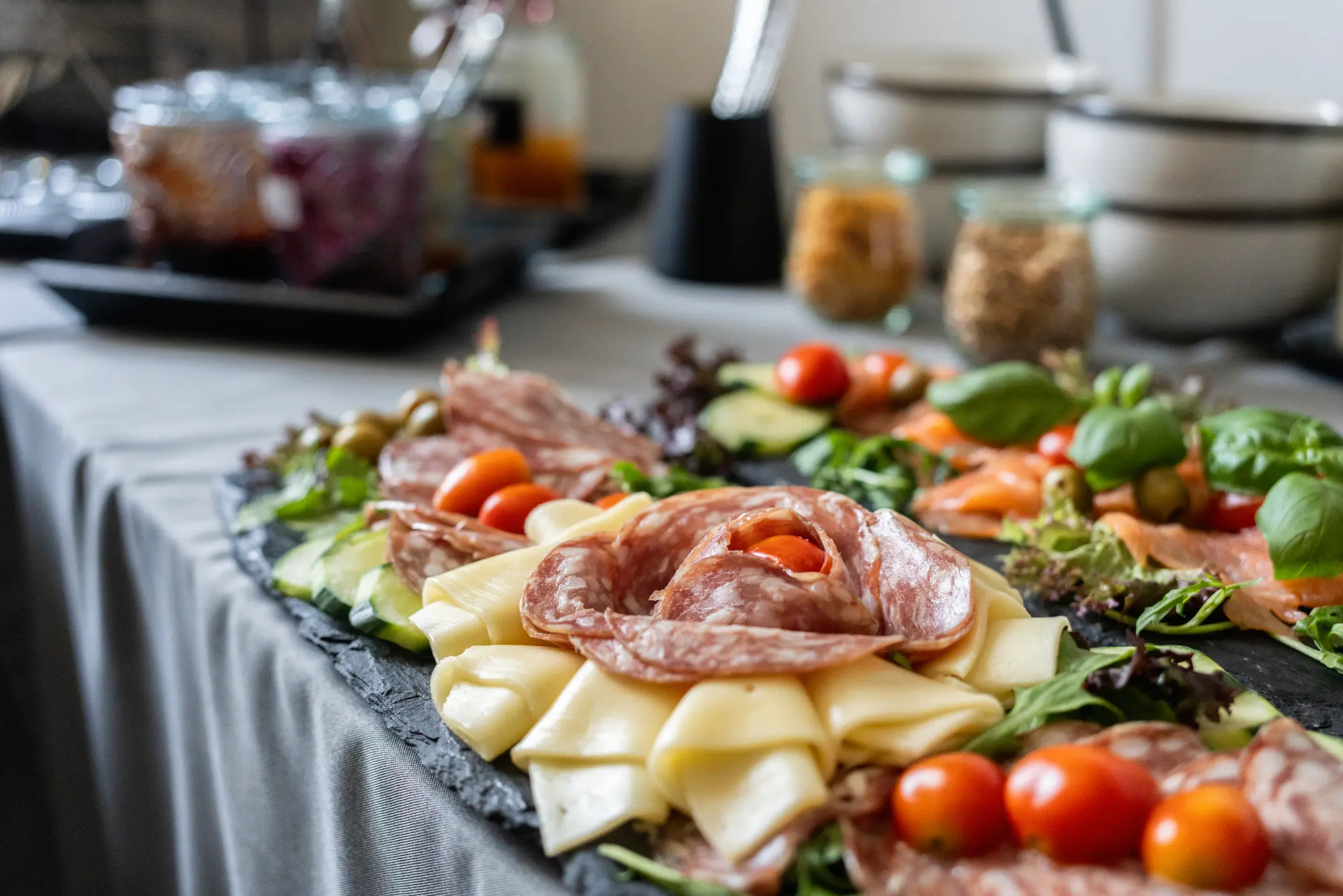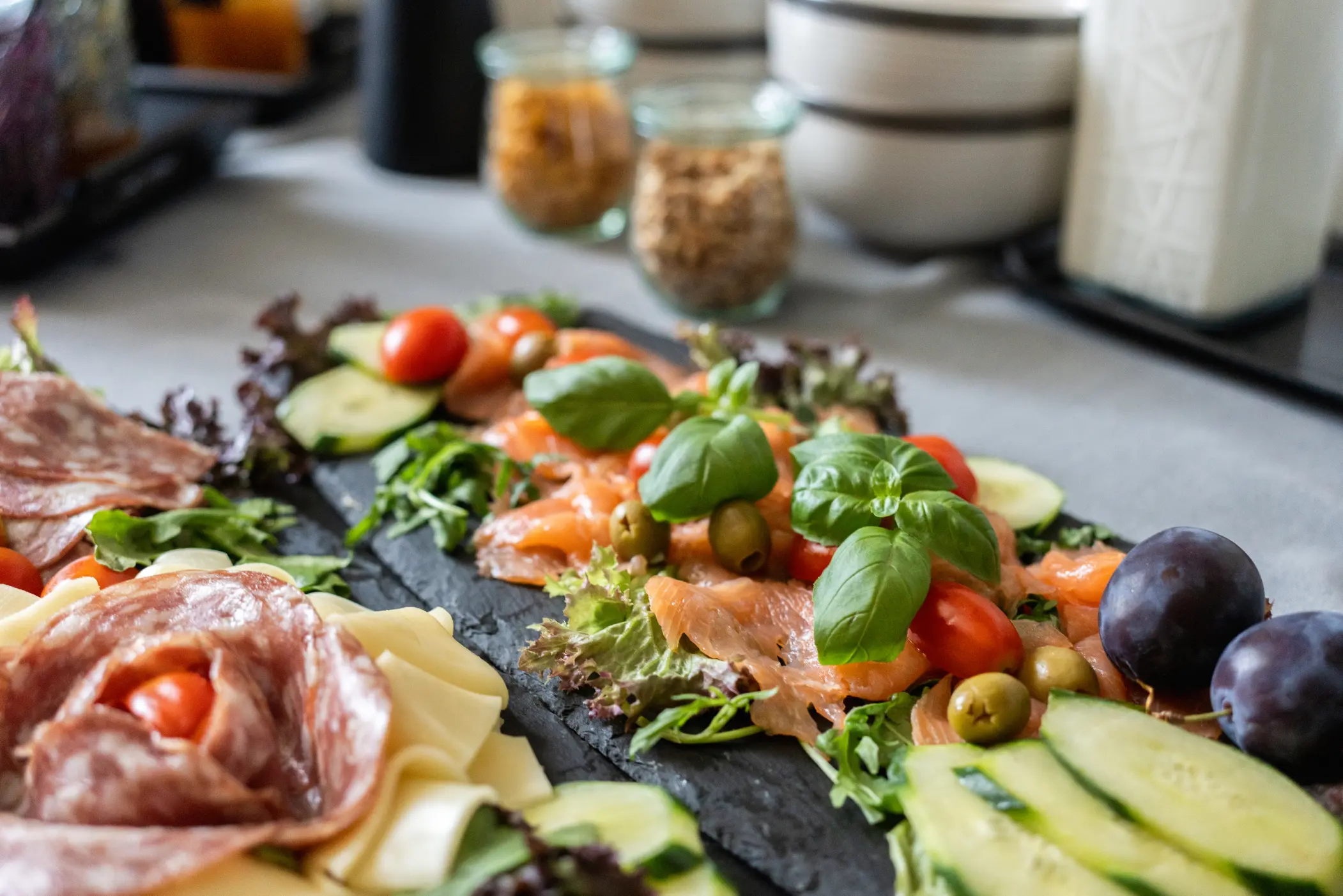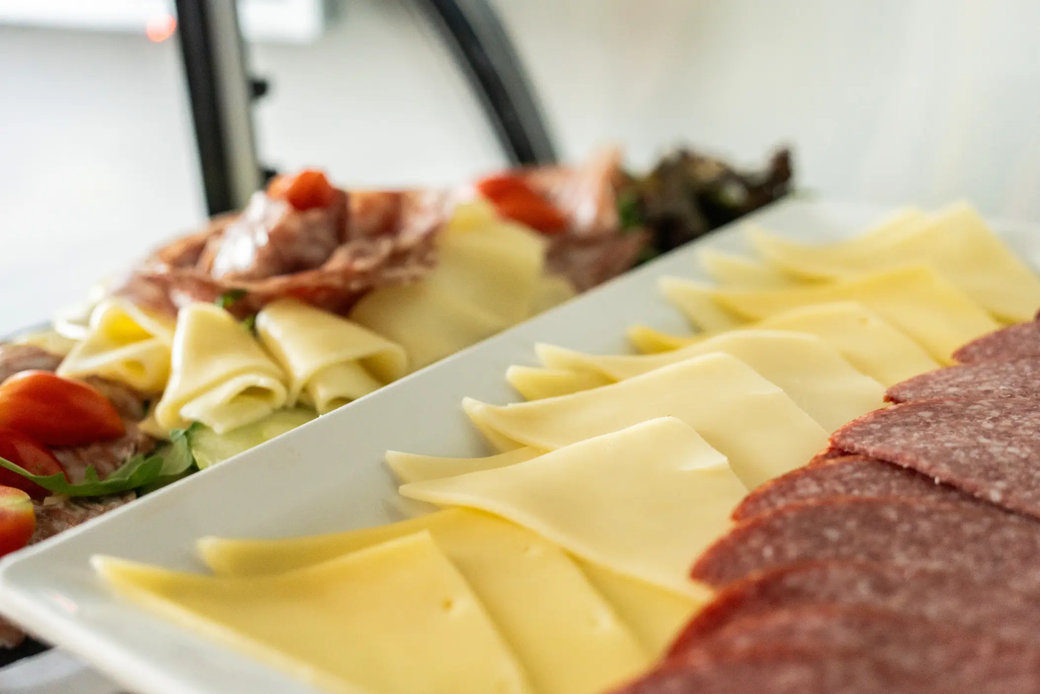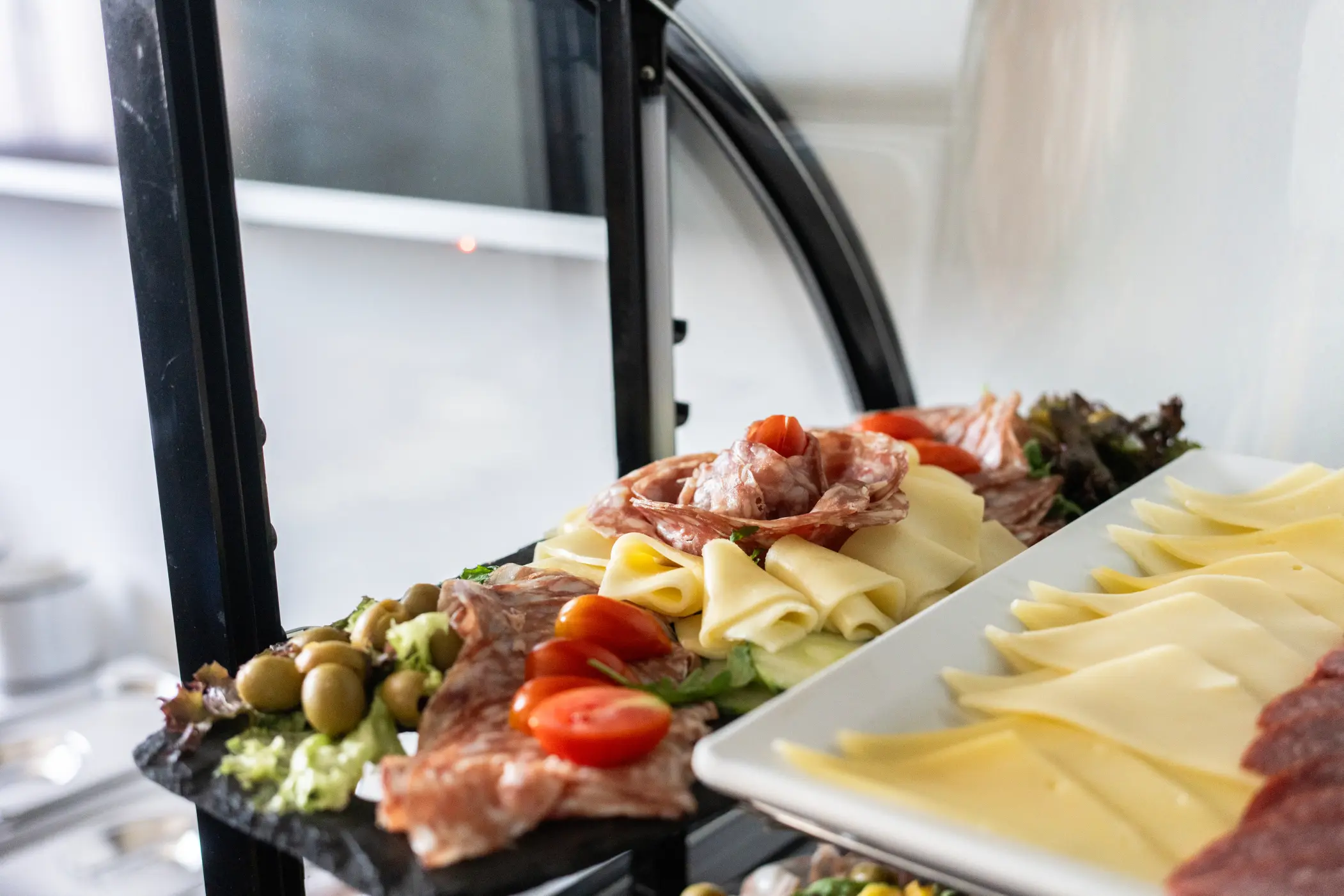 Lovers of hearty breakfasts will find a lovingly assembled selection of cold cuts and cheeses, topped off with crisp, fresh vegetables.
